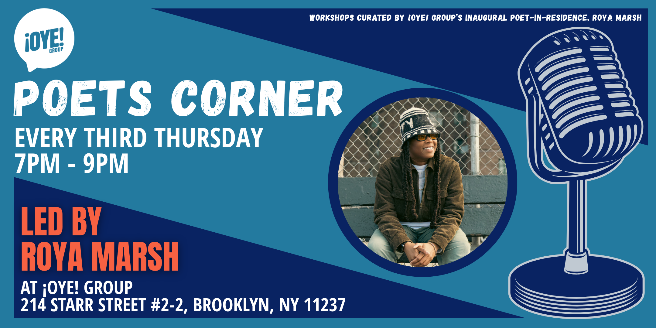 Poet’s Corner RETURNS, Led by and curated by ¡Oye! Group’s inaugural Poet-in-Residence, Roya Marsh.